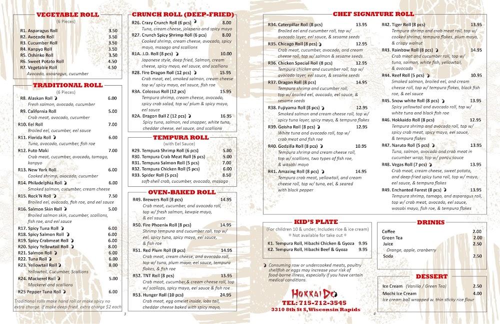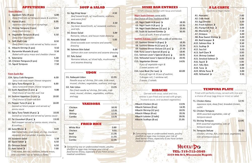 Welcome to HokkaiDo Sushi & Grill, a family-owned gem in Wisconsin Rapids, where brothers Tony and Charlie bring you the true flavors of Japan. Our menu features a delightful array of authentic sushi and grilled dishes, paired perfectly with a curated selection of wine, beer, and sake. Enjoy a meal in our inviting atmosphere, whether dining in, taking out, or enjoying the convenience of our delivery services. We cater to all tastes, including vegetarian options, and offer accessible seating. Join us for an unforgettable dining experience that celebrates the joy of sharing delicious food!